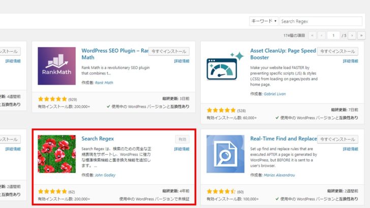 まずはプラグインから「Search Regex」を取得し、有効化していきましょう。