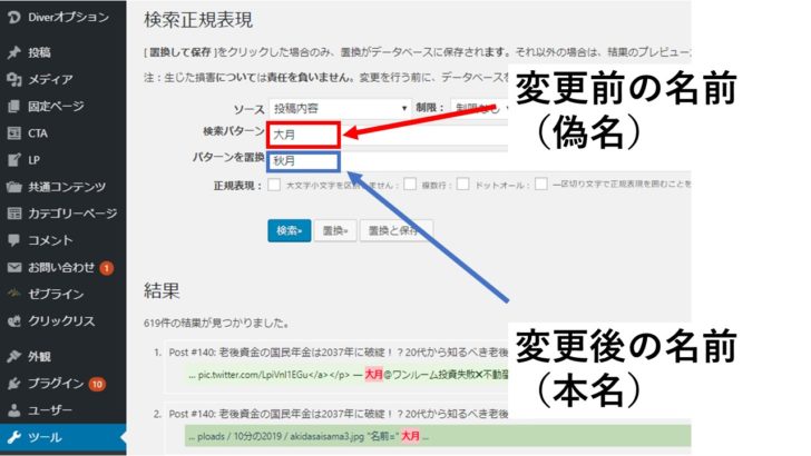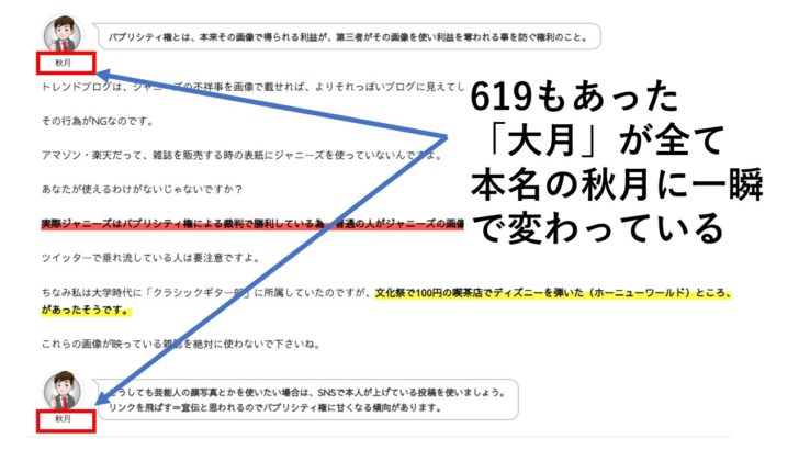 そしたら、「置換と保存」をクリックすることで、大月(偽名)からたふい(実名)に変更されます。