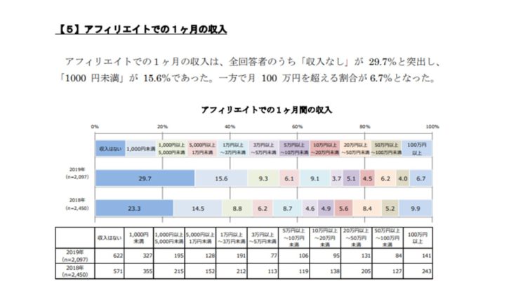 2019年になると、年数関係なしでアフィリエイトでやっている人の2割は月10万を達成しています。